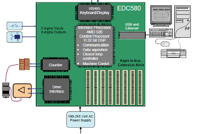 • Drive Interface: ±10 V command output with ±15 Bit resolution digital command output I/O’s and relays for safety functions