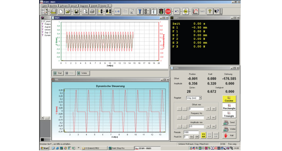 DynPack displays the following information in parallel windows on the screen: measured values in a digital manner, on-line graph with reduction of data, the covering curve and the oscilloscope window. It is possible to assign simple limits as well as inner and outer limits to the amplitude for each working block. The assignment can be done in a relative absolute manner.